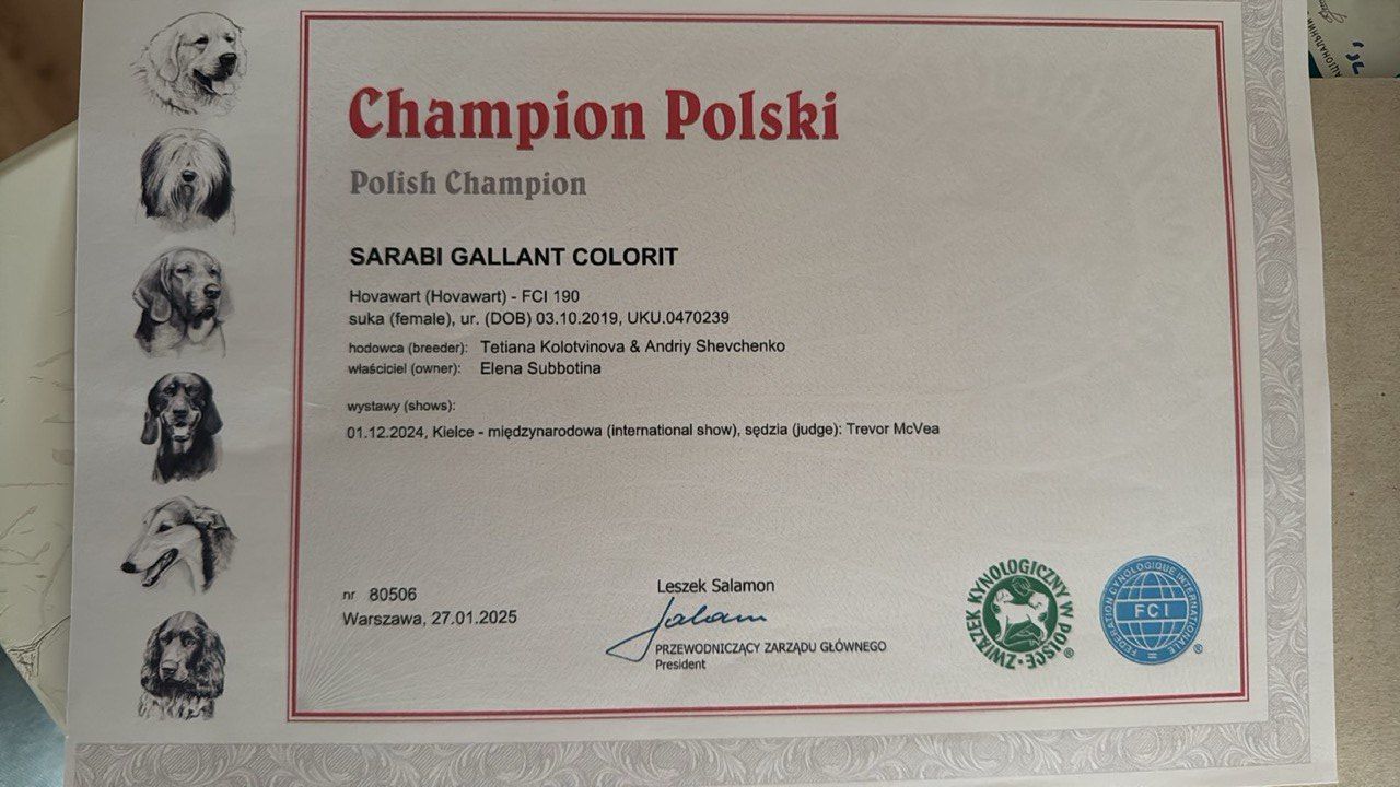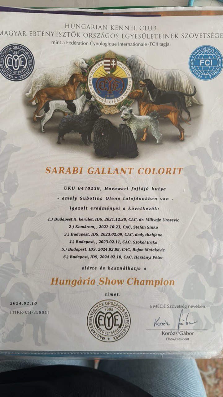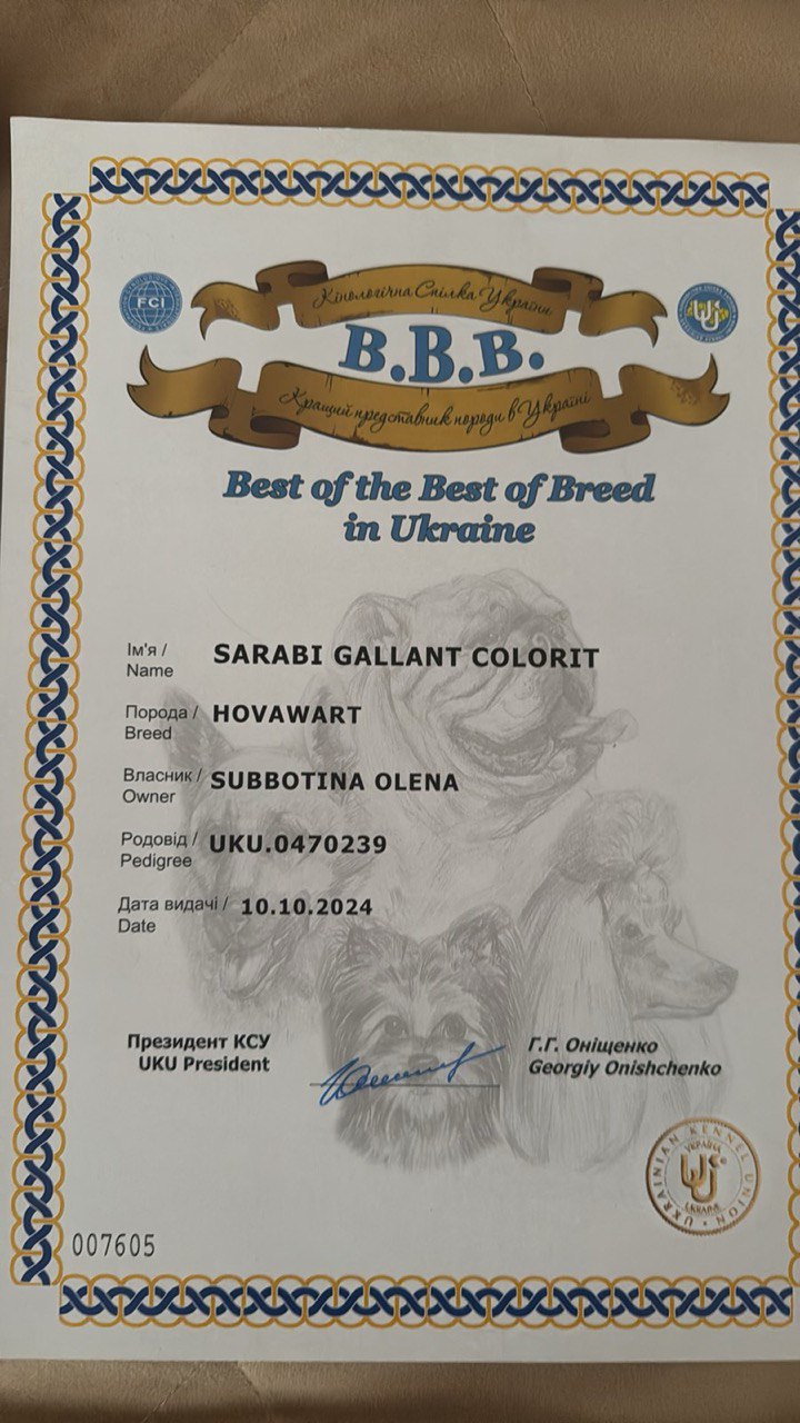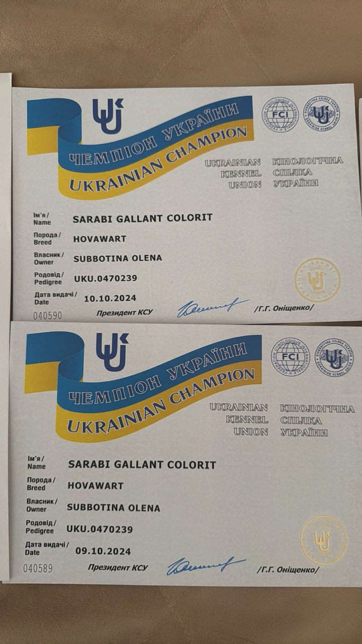 Champion of Ukraine, Champion of Moldova and Grand Champion of Moldova, Champion of Hovawart Club of Ukraine ( 2019, 2021)