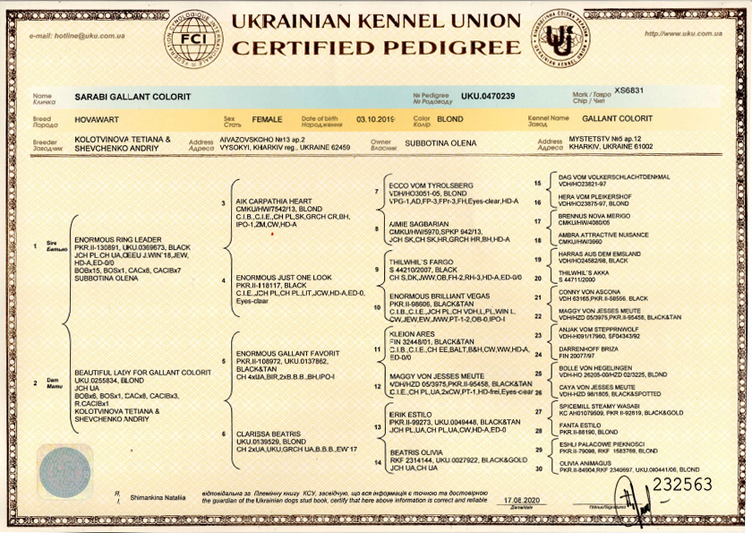 Champion of Ukraine, Champion of Moldova and Grand Champion of Moldova, Champion of Hovawart Club of Ukraine ( 2019, 2021)
