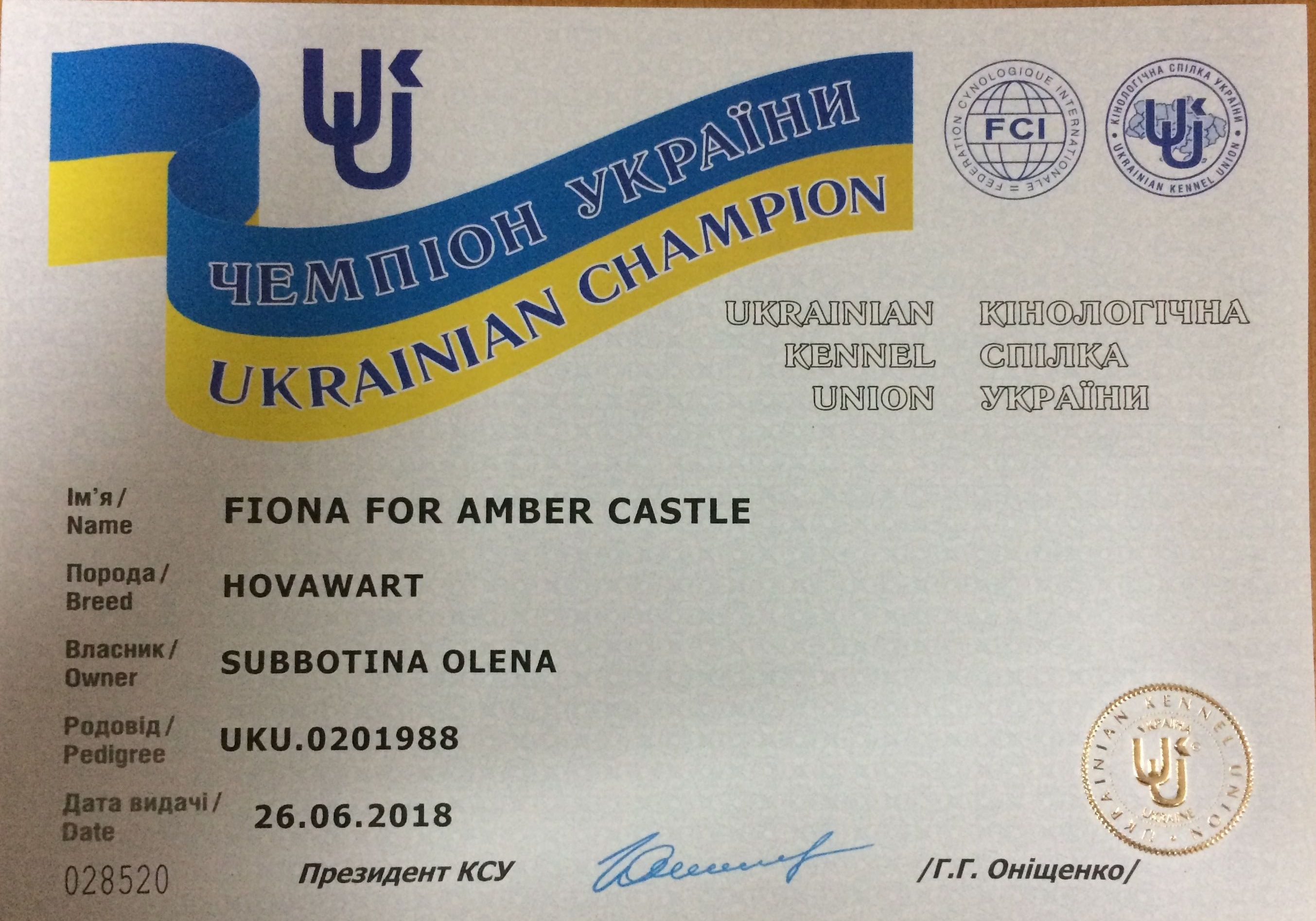 Fiona завоевала титулы Чемпиона Украины, стала, многократной обладательницей САС и САСIB, победительница монопородной выставки ВКП Ховаварт 2018, Чемпион Центральной и Восточной Европы 2018.