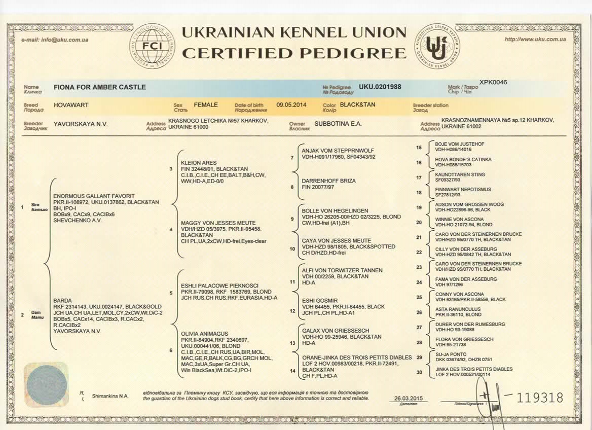 Дочь Барды (05.03.2008 – 08.2016) Чемпионки Украины, неоднократной победительницы монопородной выставки ВКП Ховаварт) и Enormous Gallant Favorit (l07/11/2011), Чемпион Украины, Чемпион Беларуси, России, Интер Чемпион, IPO 1.